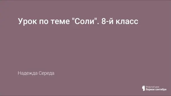 Дается понятие о составе и классификации солей, совершенствуется умение учащихся по составлению уравнений химических реакций и номенклатуре солей; формируются навыки работы в парах при выполнении лабораторных опытов, ведения обсуждений, заключение выводов.