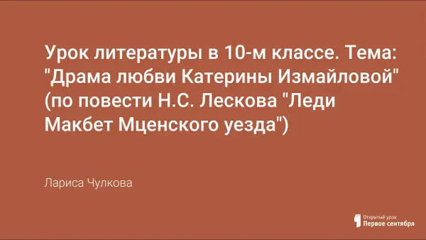 Цели урока: рассмотреть сюжет повести Н.С. Лескова "Леди Макбет Мценского уезда", образ главной героини; обратить внимание учащихся на то, как трактовался этот образ в различных произведениях искусства; развить умение анализировать образ героини, умение видеть в тексте изобразительно-выразительные средства.