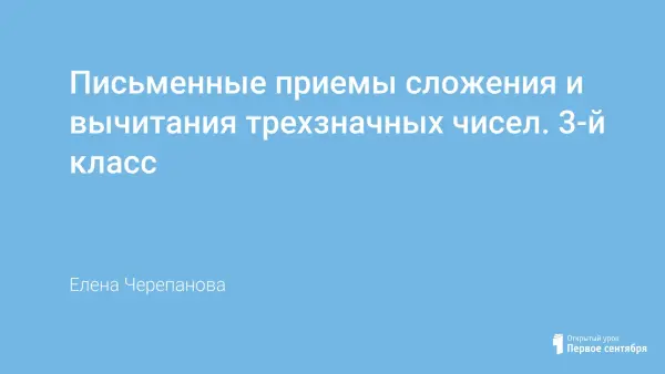 Цели урока: рассказывать алгоритм письменного сложения и вычитания трёхзначных чисел в пределах 1000; выполнять устное и письменное сложение и вычитание трёхзначных чисел в пределах 1000; сравнивать трехзначные числа; решать задачу и оформлять вычисление письменно; переводить единицы измерения времени из меньших в большие и выполнять действия с ними.