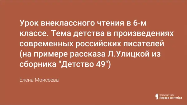 Предлагаемому уроку предшествовало знакомство с повестями о детстве Л.Н.Толстого и М.Горького. Его основные цели – познакомить шестиклассников с именем Людмилы Улицкой, прочитать и проанализировать один из её рассказов, подготовить учеников к составлению отзыва о нём; определить, чем отличается детство, описанное в произведении Улицкой, от детства сегодняшнего.