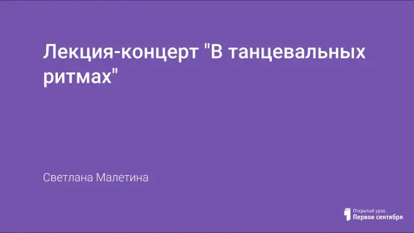 Цель лекции-концерта – познакомить детей с изменениями танцевальной моды, начиная с танцев, дошедших до нас из глубины веков, до современности. В ходе лекции рассматриваются вопросы родины танцев, среды, в которой они зародились, хореографические особенности каждого из них, примеры использования в произведениях композиторов-классиков.