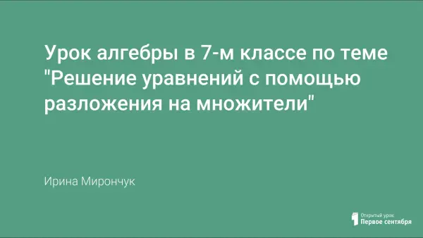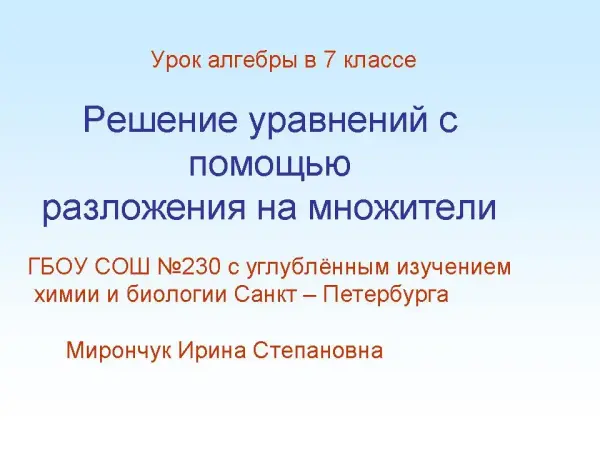 В процессе работы повторяются способы разложения на множители и формулы сокращённого умножения. В каждой паре выставляются оценки. После устной работы фронтально решаются уравнения с использованием различных способов разложения на множители. В процессе самостоятельного решения уравнений учащиеся закрепляют изученный на уроке материал.