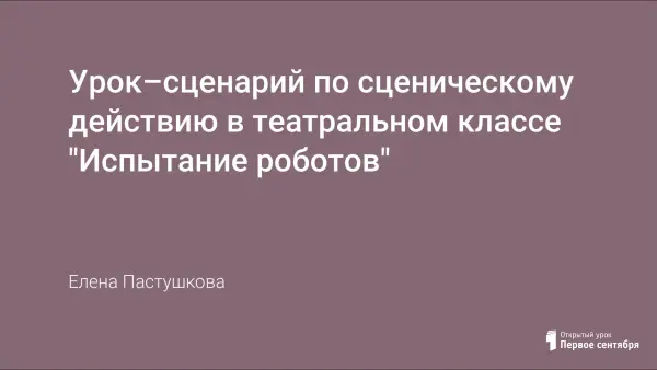 Материал представлен в виде сценария к открытому уроку по предмету "Сценическое действие" в театральном классе - "Испытание роботов" (согласованность коллективного действия). Сценарий рекомендован педагогам начальной школы, где преподают уроки театра, педагогам дополнительного образования.