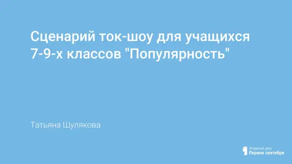 Ток-шоу "Популярность" призвано привлечь внимание к проблеме самоопределения человека в мире. Разные люди, разные причины их популярности помогут лучше понять себя, увидеть свои достоинства и недостатки. Подготовительная работа не занимает много времени, но эффект живого общения позволяет в неформальной обстановке заметить новое в знакомых людях.