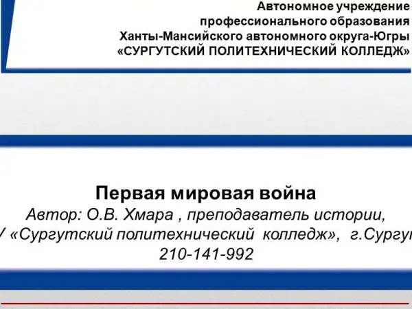 Урок по теме «Первая мировая война» является уроком изучения новой темы. Автор представляет свою попытку подачи темы. Активно используется самостоятельная деятельность учащихся для изучения событий Первой мировой войны. Привлекаются иллюстрации картин Верещагина для осмысления итогов любой войны. Тема изучается на 2-х часовом занятии.