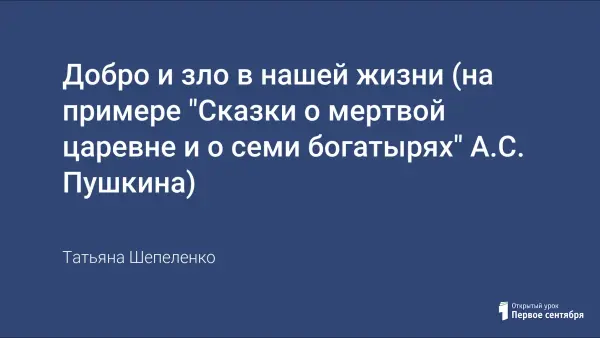 Представлен урок литературы в 5-м классе. Учащимся предлагается порассуждать о добре и зле в нашей жизни. А помогает в этом «Сказка о мертвой царевне и о семи богатырях» А.С. Пушкина. Также на уроке обобщаются знания и о других сказках великого писателя. На уроке используется технология проблемного обучения.