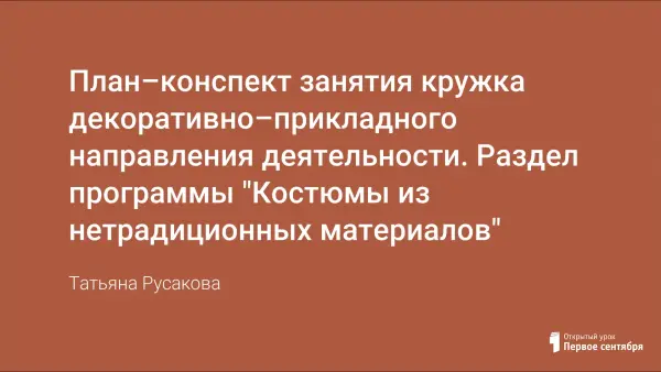 Кружковая работа позволяет более полно раскрыть творческий потенциал учащихся, создать предпосылки для реализации ситуации успеха. В работе представлен план-конспект занятия кружка по созданию костюмов из нетрадиционных материалов.