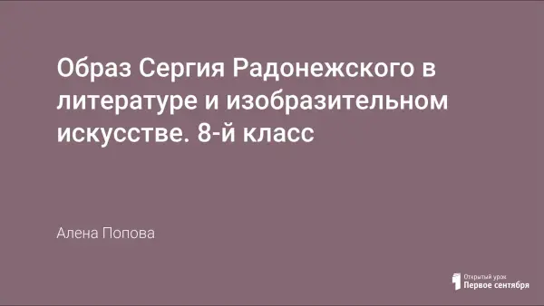 Цель урока: раскрыть светлый образ великого святого, просветителя. Тема имеет большое воспитательное значение, т.к. учит трудолюбию, скромности, нравственной чистоте на примере жизни С.Радонежского. Класс делится на две группы: литературоведов и искусствоведов, которые готовят к уроку нужный материал. Включенные в урок музыкальные произведения создают особый эмоциональный настрой.