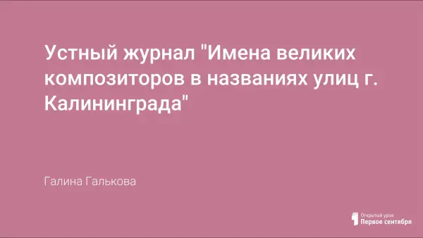 Каждый город имеет историю, культурные ценности, в том числе и музыкальные. На изучение истории города направлена работа с учащимися по проекту музыкально-краеведческого направления «Имена великих композиторов в названиях улиц г. Калининграда» и элективного курса «Музыкальный Кёнигсберг-Калининград».