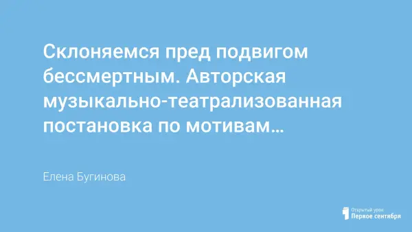 9 мая 2020 г. народ России и все передовое человечество отмечает 75-летие Победы в Великой Отечественной войне. Исторические события 1941–1945 годов не просто веха в истории поколения, а годы великого смятения, борьбы, мужества и отваги народов Советского Союза. Нынешнее поколение в неоплатном долгу перед теми, кто остался на полях сражений, перед теми, кто вернулся, обеспечив мир на Земле и великую Победу. «Склоняемся пред подвигом бессмертным» - авторская музыкально-театрализованная постановка по мотивам произведения Аркадия Гайдара «Сказка про военную тайну, Мальчиша-Кибальчиша и его твердое слово» для детей младшего школьного возраста. Посвящена детям, сражавшимся в тылу и на фронтах ВОВ.