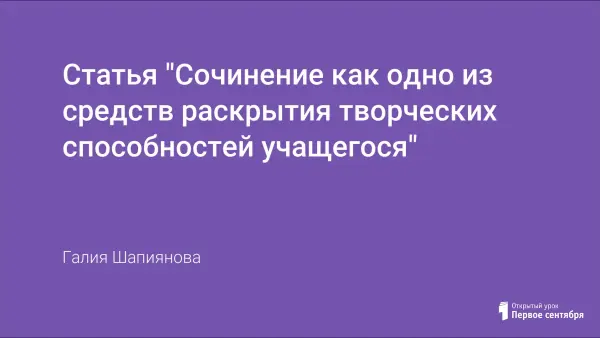 Урок развития речи как форма учебного занятия предоставляет большие возможности для развития творческих способностей учащегося. Какими основными умениями должен овладеть ученик? Как избавить ученика от упрёка в списывании, в компиляции? В статье предлагаются разные способы написания школьного сочинения, учитывая характер материала, склад ума школьника, его творческие способности.