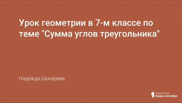 На этом уроке учащиеся знакомятся с теоремой о сумме углов треугольника. Урок состоит из трех этапов: практической работы, доказательства теоремы несколькими способами, решения задач. Учащиеся имеют возможность проверить справедливость теоремы на плоскости.