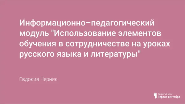 Информационно-педагогический модуль "Использование элементов обучения в сотрудничестве на уроках русского языка и литературы" разработан в соответствии с технологией обучения в сотрудничестве и личностно-ориентированного обучения. Данный модуль предназначен для эффективной работы с группами разного уровня обученности, поэтому его можно применять на уроках русского языка и литературы.