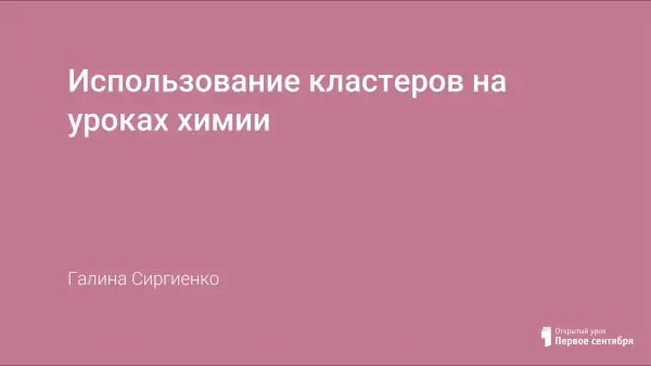 В данном докладе дано определение понятия «кластер», приведены примеры использования кластеров как графической организации материала, раскрывающей смысловые структуры того или иного понятия, изучаемых на уроках химии. Приведены кластеры по теме «Арены», классификация гелей, кластер «Роль воды в превращении веществ».