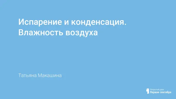 На уроке формируются понятия "испарение", "конденсация", "влажность". Рассматривается принцип действия и устройство психрометра. Сравниваются процессы испарения и кипения, объясняются причины зависимости скорости испарения от температуры, рода вещества, площади поверхности от ветра. На уроке используются материалы единой коллекции цифровых образовательных ресурсов, ФЦИОР.