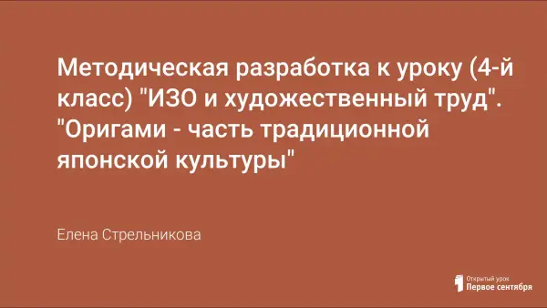 Урок ставит своей целью познакомить учащихся с художественной культурой Японии на примере традиционного искусства – оригами. Результатом урока после знакомства с культурой и традициями Японии станет выражение собственных впечатлений, образов в открытке.