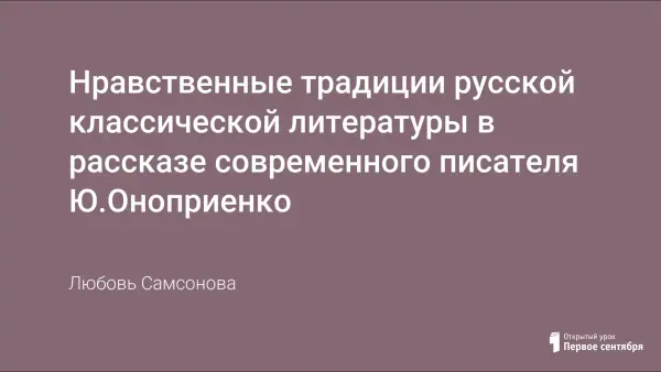 В ходе урока учащиеся узнают о современном писателе Ю.Оноприенко, анализируют содержание и художественные особенности рассказа «Еда», формулируют вывод о том, что данный рассказ продолжает лучшие нравственные традиции в изображении человека, заложенные классиками русской литературы: Пушкиным, Гоголем.