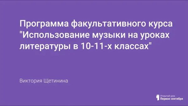 Цель факультативного курса в 10-11-х классах заключается в совершенствовании духовно-нравственного потенциала всесторонне развитой личности через приобщение к музыкальной культуре в ходе гуманитарного образования на уроках литературы.
