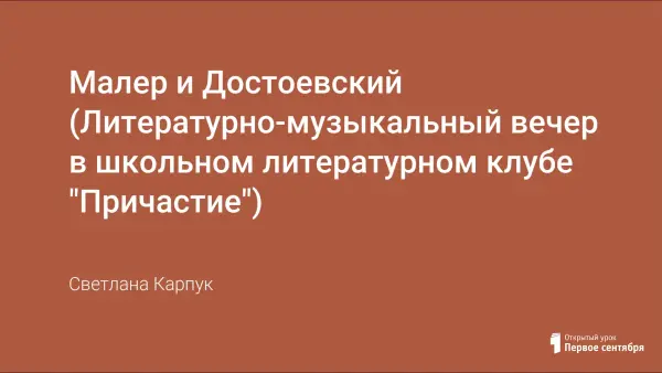 Представлен материал исследования, связанного с творчеством Ф.М. Достоевского и Густава Малера, который мы обозначили в жанре литературно-музыкальные параллели.