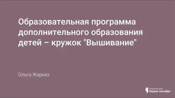 Образовательная программа дополнительного образования детей, кружок "Вышивание", рассчитана на годичный курс обучения школьников 12-13 лет. Программа может быть использована как в основном образовательном учреждении, так и в учреждениях дополнительного образования школьников.