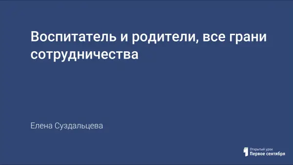Взаимодействуя с родителями ребенка, педагог проводит огромную работу, планируя различные мероприятия, беседы, мастер классы, семинары, консультации и др. Отношение родителей к воспитателю основывается не только на уважении к опыту работы и компетентности педагога, в вопросах воспитания, но и его заботливости и внимании к ним и их ребенку. В условиях современного детского сада родители могут в любое время прийти в группу, понаблюдать за поведением своего ребенка в группе. Результатом посещения родителей является то, что они замечают отношение к ребенку других людей.