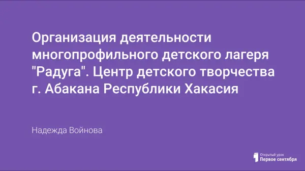 На базе Центра детского творчества г. Абакана работает многопрофильный лагерь с дневным пребыванием детей "Радуга". Воспитанниками являются обучающиеся Центра детского творчества, а так же дети и подростки из школ города в возрасте от 7 до 15 лет. Представляю программу деятельности, разработанную в оздоровительном лагере "Радуга".