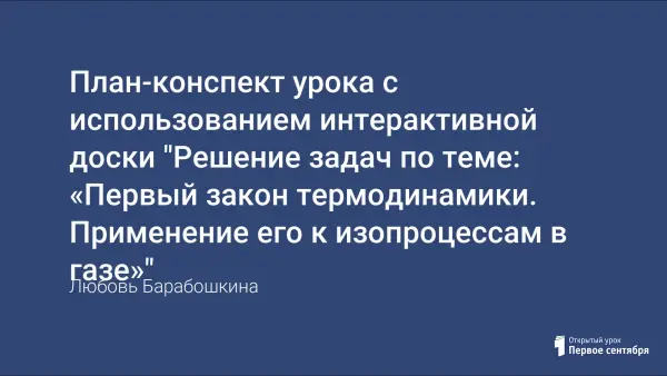 Использование интерактивной доски на уроках физики - это ещё один шаг к экономному расходованию времени урока, повышению интереса к предмету. Цель урока - закрепить изученный материал по в ходе решения качественных, расчётных и графических задач; продолжить формирование умения использовать первый закон термодинамики для описания процессов в газах.