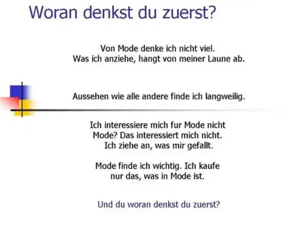 Урок немецкого языка «Знаешь ли ты, что сейчас в моде» можно провести по темам «Одежда», «Приготовления к путешествию». Итог урока ‒ мини-проект, показ мод, реклама или создание странички глянцевого журнала мод. В основе урока деятельностный подход к обучению, урок имеет практическую направленность.