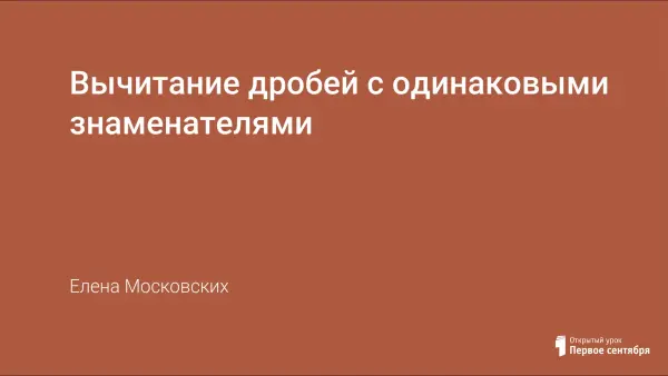 Ученики знакомятся с алгоритмом вычитания дробей с одинаковыми знаменателями. На уроке закрепляется понятие дроби; совершенствуются вычислительные навыки, умение решать задачи. Развивается познавательный интерес, логическое мышление, внимание.