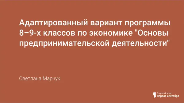 Данный вариант программы адаптирован с учетом возрастных особенностей, сокращен с 68 до 32 часов и предназначен для учащихся 8–9-х классов. Курс составлен на основе программ по начальному экономическому образованию, авторами которых являются: И.В. Липсиц ("Основы экономической политики"); Л.Л. Любимов ("Основы экономики"); В.С. Автономов ("Введение в экономику"); В.В. Овчинников ("Человек и его дело"), и сочетает различные формы и методы обучения.
