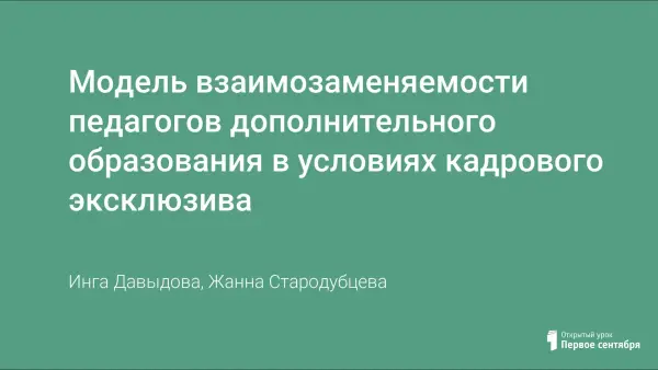 Описан опыт административной команды по созданию модели взаимозаменяемости педагогов дополнительного образования через разработку универсальных учебных занятий, которые могут быть проведены любым педагогом, независимо от специализации.