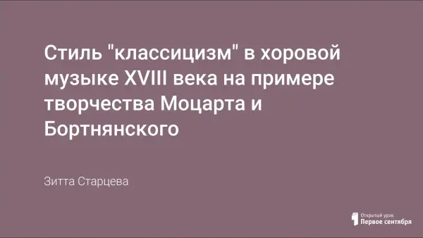 Урок способен создать условия для изучения и повторения студентами хоровых произведений композиторов эпохи Просвещения XVIII века на примере В.А. Моцарта и Д.С. Бортнянского.