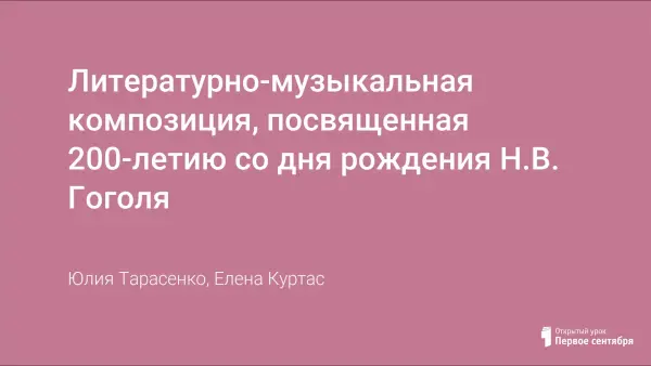 Разработка данной литературно-музыкальной композиции приурочена к 200-летию со Дня рождения Н.В. Гоголя и ориентирована на учащихся среднего и старшего звена. Использование презентации и музыкального сопровождения позволяет поддерживать интерес зрителей в течение всего представления.