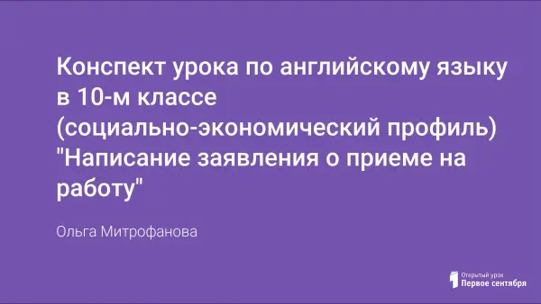 На уроке учащиеся учатся писать заявление о приеме на работу и подготавливают собственное резюме. Особое место на уроке отведено работе на компьютере для электронного оформления делового письма и резюме.