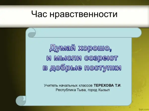 Конспект и презентация к уроку нравственности может быть использованы для классного часа или другого внеклассного мероприятия в начальной и средней школе. Занятие учит детей задумываться о своих мыслях и поступках, управлять своими мыслями, воспитывает ценнейшие человеческие качества: доброту, отзывчивость, прививает этические нормы поведения в обществе.