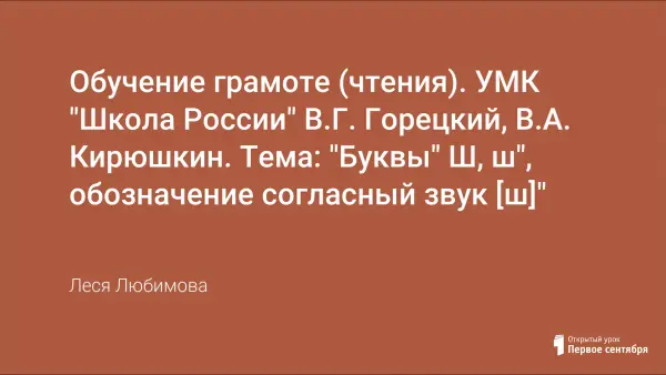 Конспект урока, цели которого сформировать понятие о звуке как о твёрдом согласном звуке; познакомить обучающихся с буквами Ш, ш; развивать фонематический слух, технику чтения, логическое мышление, внимание, речь, воображение; учить работать в паре, в группе.