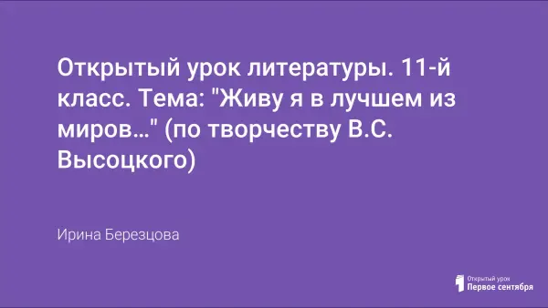 Цель урока: анализ творчества В.С. Высоцкого. Первая часть: лекция-беседа, в которой анализируется тематика и проблематика лирики поэта (на материале сборника «Нерв»). Вторая часть урока имеет творческий характер: учащиеся демонстрируют свои способности (сочиняют сказку-быль о В.Высоцком, демонстрируют свои рисунки и слайды, касающиеся поэтической и актерской деятельности В.Высоцкого).