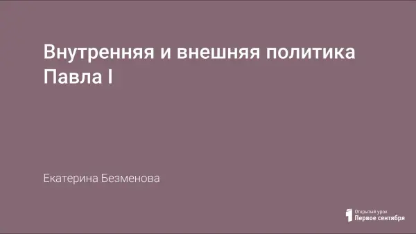 Представлены дополнительные материалы из художественной литературы, презентация к уроку. Применяется рабочая тетрадь А.А. Данилова, Л.Г. Косулиной при подготовке домашнего задания. Задачи, выполняемые на уроке: привлечение внимания учащихся к личности Павла I, показываются причины и особенности его внутренней и внешней политики, оцениваются противоречивые итоги правления Павла I.