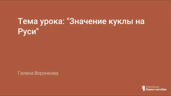 Рассказывается об уроке в 5-м классе, на котором дети знакомятся с изготовлением текстильной куклы. В процессе обучения детям прививаются любовь и уважение к народным традициям, эстетический вкус.