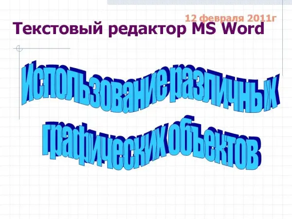 Цели урока: совершенствовать навыки работы с текстовым редактором MS Word; изучить возможность для создания рисунков с помощью панели инструментов Рисование; умение применить операции работы с графическими объектами; углубить ранее полученные знания об информации и ее видах, о текстовом редакторе и его возможностях; отработать навыки оформления электронного документа.