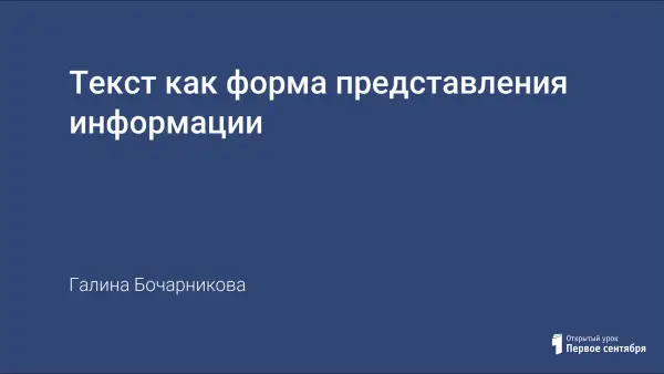 Цели урока: систематизировать и обобщить сведения, полученные учащимися на предыдущем уроке; углубить представления учащихся о формах представления информации; акцентировать внимание учащихся на тексте как одной из наиболее распространѐнных форм представления информации.