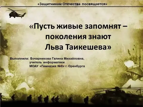 Наша гимназия носит имя героя второй Чеченской войны Льва Урумбасаровича Таикешева, подвиг которого остается в памяти гимназистов и жителей Оренбургской области.
