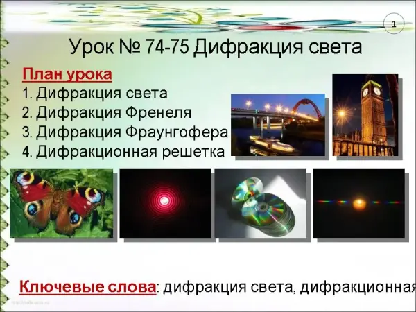 Урок детально знакомит учащихся профильных классов с одним из волновых свойств света – дифракцией, рассмотривает виды дифракции, выясняет особенности дифракции Френеля и Фраунгофера, формирует навыки расчета дифракционных картин, используя возможности аудиовизуальной формы представления учебного материала в виде презентации.