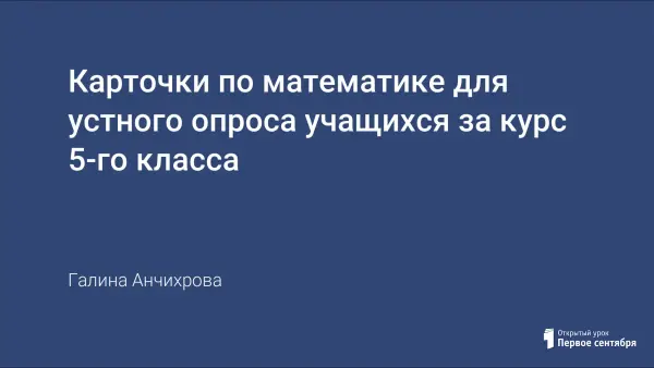 Карточки для устного опроса учащихся по математике за курс 5-го класса составлены для школьников, изучающих математику по учебникам "Математика, 5" М.Я. Виленкина и др. и "Математика, 5" Э.Р. Нурка и др. Карточек 25 по 5 вопросов, что соответствует примерной наполняемости класса. Вопросы составлены по всему курсу 5-го класса. Проводя такие итоговые опросы с 5-й по 11-й классы, мы создаем предпосылки для успешной сдачи ГИА-9 и ЕГЭ-11 по математике.