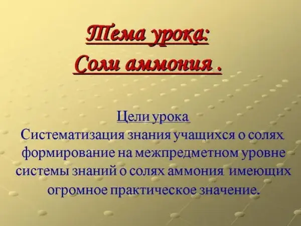 Цели урока: систематизировать знания учащихся о солях; формирование на межпредметном уровне системы знаний о солях аммония, имеющих огромное практическое значение; выработать практические навыки проведения качественных реакций на соли аммония; умение анализировать увиденное; развитие логического мышления.