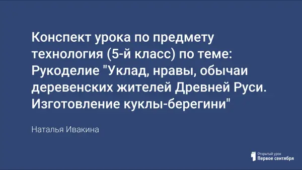 В ходе урока учащиеся узнают историю деревенской тряпичной куклы-оберега, также знакомятся с традициями воспитания деревенских детей Руси в древности. Учащиеся учатся самостоятельно по показу учителя изготавливать деревенскую куклу-оберег, используя те технологии изготовления куклы, которыми пользовались деревенские девочки и женщины в давние времена.