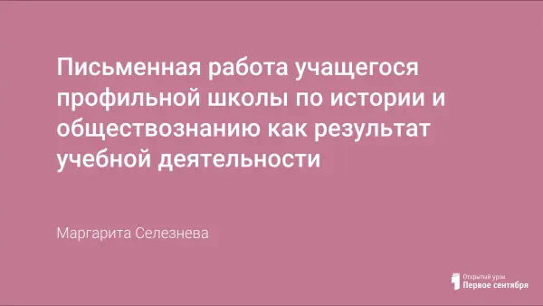 Диагностика и оценивание результатов учебной деятельности школьников важны для учителя, работающего в профильной школе. Неотъемлемой частью этой системы должны стать письменные работы (аннотация, эссе и др.). В сочетании с различными формами оценивания предметных результатов учебной деятельности они будут прекрасным инструментом для диагностики метапредметных результатов обучения учащихся.