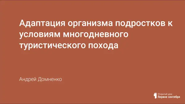 Активный отдых на природе – самый лучший способ восстановить работоспособность и снять утомление, накопившееся за год. Но не каждый подросток 14–16 лет способен выдержать нагрузки многодневного похода. Цель представленной работы состоит в выявлении адаптационных реакций организма подростков на условия многодневного туристического похода.