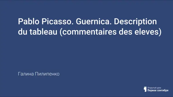 Урок посвящен изучению жизни и творчества известного художника XX века – П.Пикассо, анализу его всемирно известной картины - «Герника». Материал может быть изучен в серии уроков, на факультативных занятиях, посвященных данному художнику, элективном курсе при изучении материалов по страноведению. Презентация посвящена «Гернике», дается подробный комментарий к истории создания картины, звучат комментарии учащихся на французском языке.