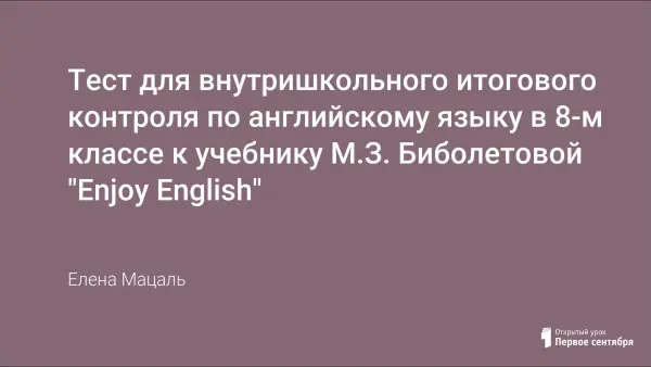 Тест к УМК М.З. Биболетовой "Enjoy English" ("Английский с удовольствием"), 8-й класс, предлагается для внутришкольного контроля по результатам обучения в течение года, пригоден для использования в нескольких классах одной параллели и принятия решения о переводе ребенка в следующий класс. Содержит тестовые задания открытого типа (дополнения, свободного изложения) и закрытого типа (альтернативных ответов, восстановления соответствия).